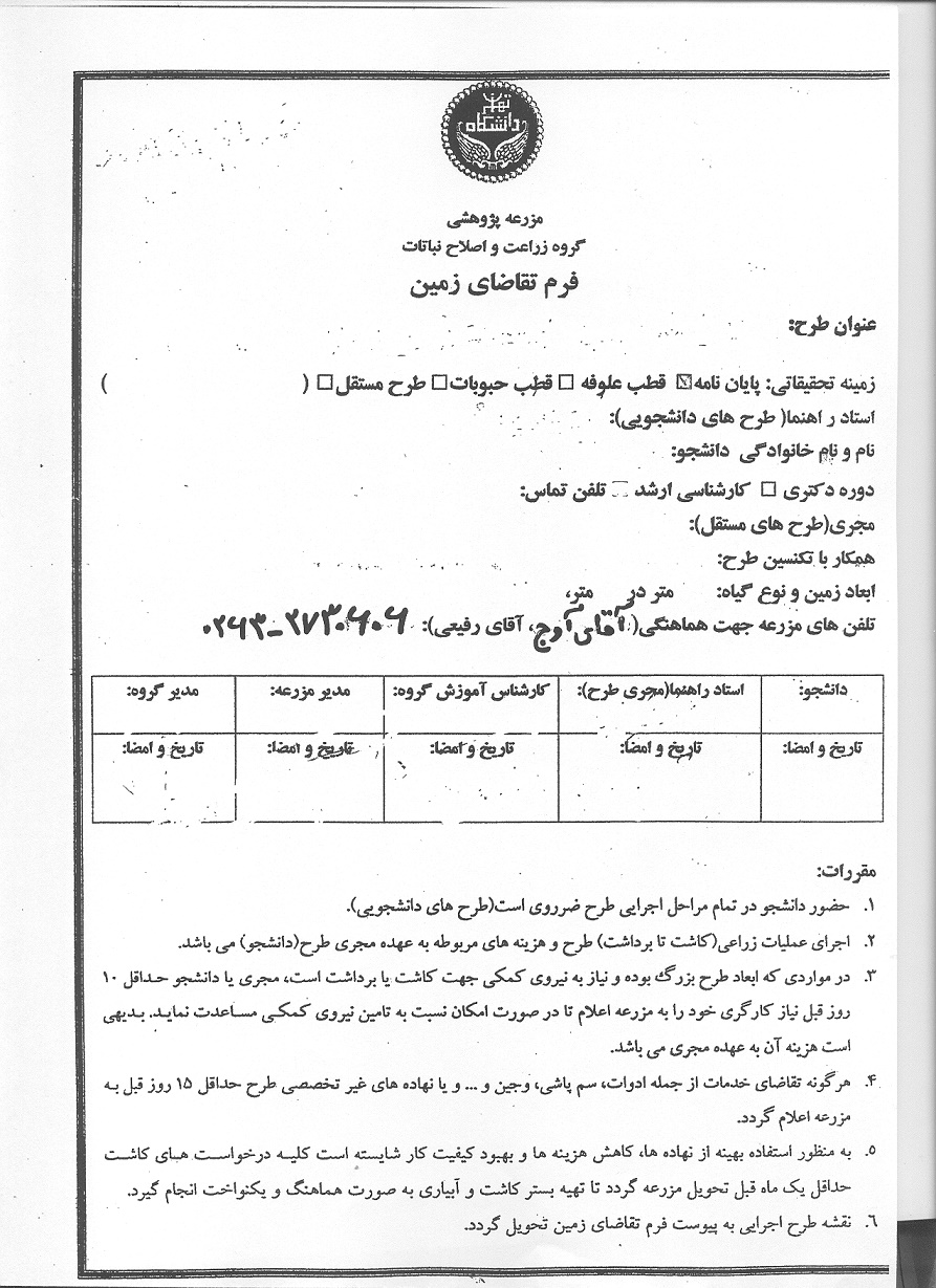 مرزعه آموزشی و پژوهشی در حدود 60 هکتار ( نام مسئول دکتر جهانسوز)